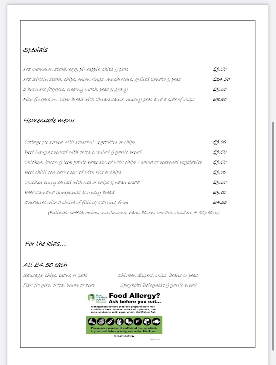 - Specials: Includes hearty meals like 8oz gammon steak served with egg, pineapple, chips, and peas; 8oz sirloin steak accompanied by chips, onion rings, mushrooms, grilled tomato, and peas; and fish fingers on tiger bread with tartare sauce, mushy peas, and chips.